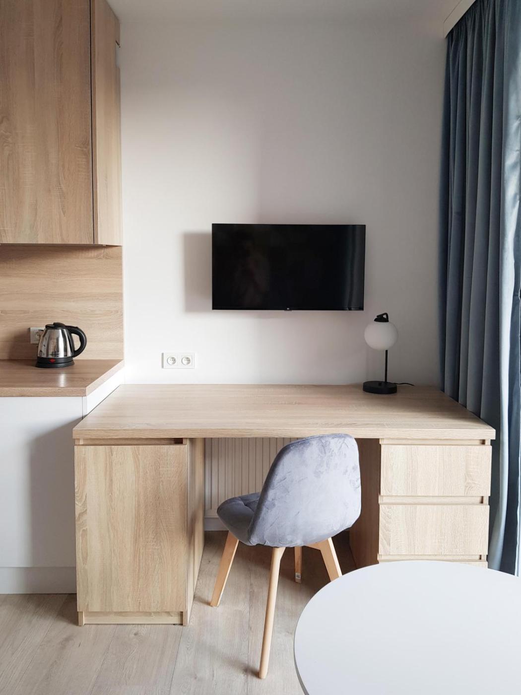 Studio z rozkładaną sofą. Guests can make meals in the kitchenette that is equipped with a stovetop, a refrigerator, kitchenware and a microwave. The studio provides a washing machine, a wardrobe, a balcony with garden views as well as a private bathroom featuring a shower. The unit offers 1 bed. Studio - 2 osobowy. Powierzchnia pokoju ok.: 15 mkw.