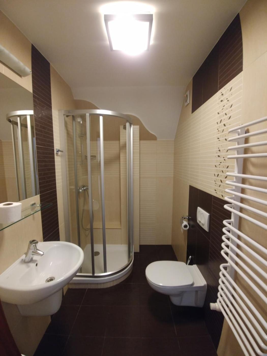 Pokój rodzinny. The family room includes a private bathroom fitted with a shower. The family room features a wardrobe, parquet floors, heating, a flat-screen TV, as well as garden views. Rodzinny - 5 osobowy. Powierzchnia pokoju ok.: 1 mkw. ;