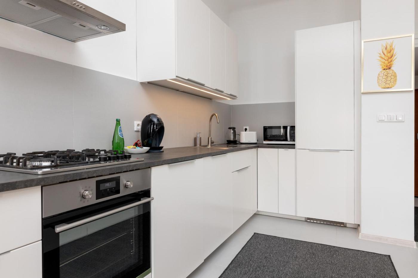 Oferta apartamentu obejmuje sypialnię (1), salon, aneks kuchenny z pełnym wyposażeniem, w tym lodówką i ekspresem do kawy, a także łazienkę (1) z prysznicem oraz bezpłatnym zestawem kosmetyków. W apartamencie zapewniono ręczniki i pościel.