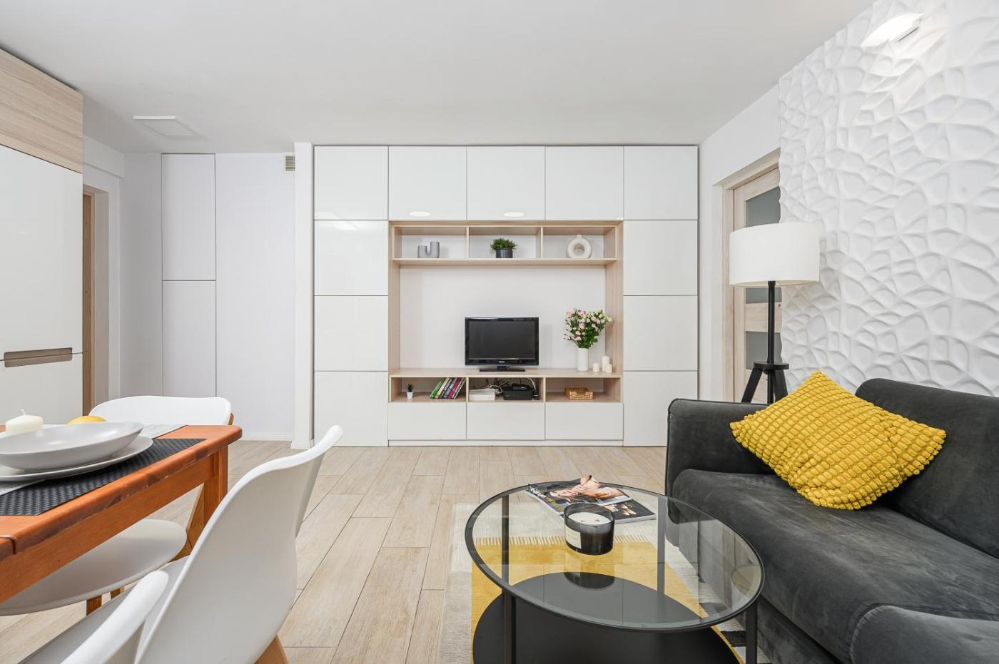 Apartament z 2 sypialniami. Featuring a private entrance, this apartment is comprised of 1 living room, 2 separate bedrooms and 1 bathroom with a shower and a hairdryer. In the well-fitted kitchen, guests will find a stovetop, a refrigerator, a dishwasher and kitchenware. The apartment offers a washing machine, soundproof walls, a tea and coffee maker, a flat-screen TV with streaming services, as well as city views. The unit offers 3 beds. Apartament - 5 osobowy. Powierzchnia pokoju ok.: 55 mkw. ;